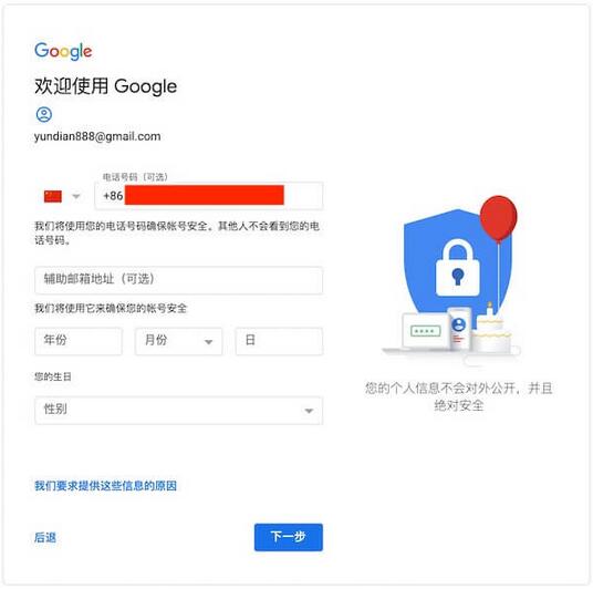 3、谷歌为了防止机器注册,会让我们验证手机号码,手机号前面地区我们选择中国,号码就填写你自己的号码,记得前面加+86,然后下一步。