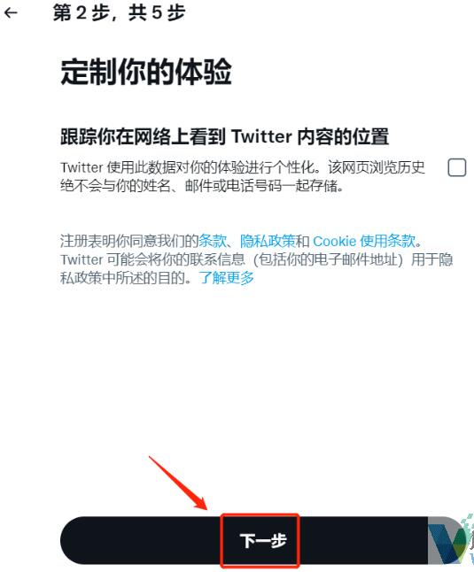 3、根据您的喜好选择推特跟踪您的电子足迹以便指定个性化内容,然后点击【下一步】;