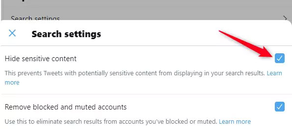 为此,请访问Twitter网站并单击菜单>设置和隐私>内容首选项>搜索设置。在此处取消选中“隐藏敏感内容”。
