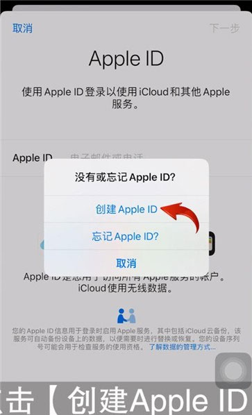 2、轻点“创建新 Apple ID”。如果您没有看到这个选项,请确保您已退出登录 iCloud。