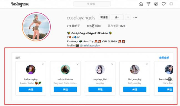 当你关注某一个用户后,Instagram也会向你推送大量相关主题的其他用户。