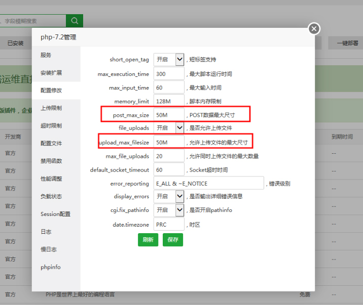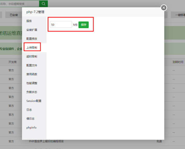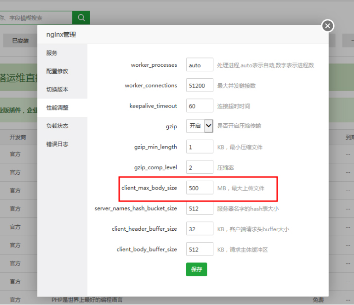 2.选择性能调整,其中有一个选项叫做 client_max_body_size,表示最大上传文件,将其调整为你需要的最大数值即可