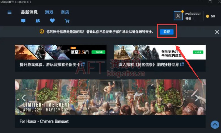 5、这个时候,就注册好了。我们用刚刚注册好的账户登录到uplay客户端,客户端会提示你验证邮箱,我们点击验证。