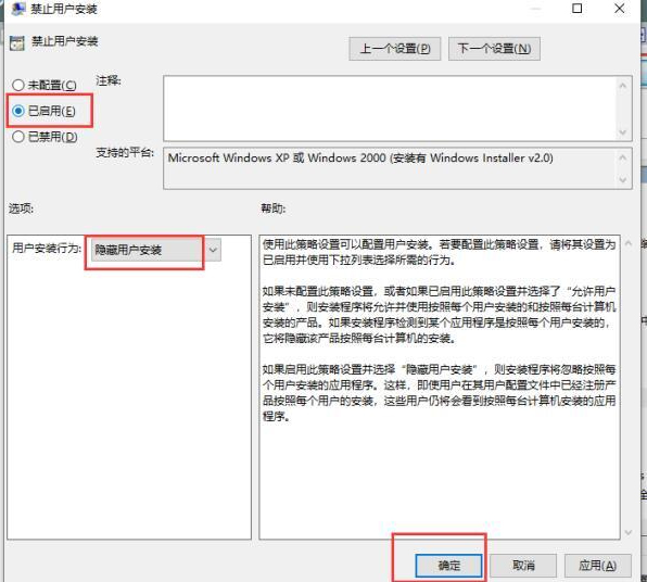 5、进入到禁止用户安装的窗口后,勾选“已启用”,然后将下方的”用户安装行为“改成”隐藏用户安装“,最后点击确定即可。