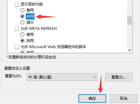 7、将“显示混合内容”改为“启用”,单击下方的“确定”,重启百度浏览器就可以啦。