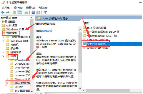 5.回到刚才的界面,选择“管理模板”,点击“网络”-“Qos数据包计划程序”,双击“限制可保留带宽”;